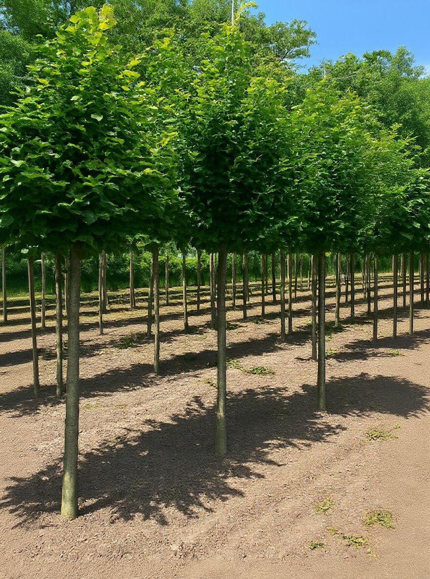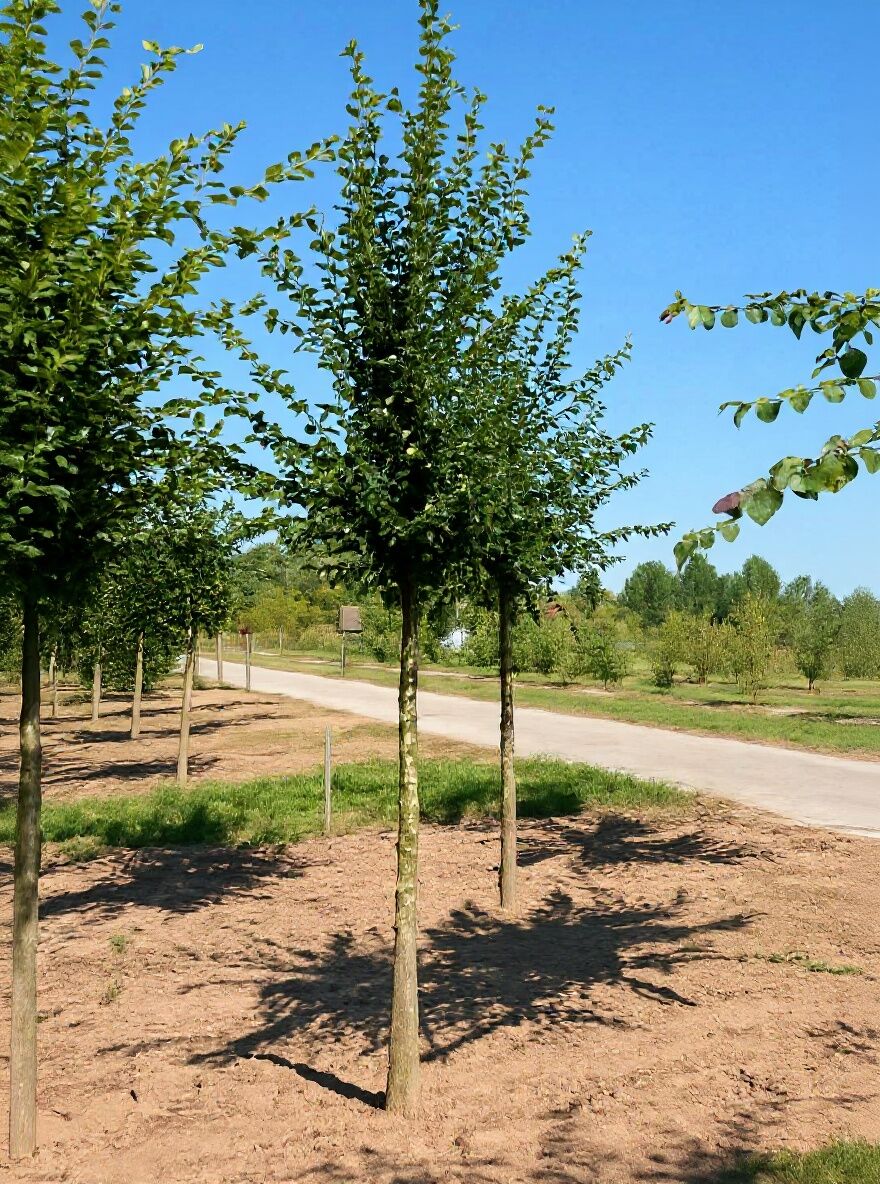 Säulen-Hainbuche 'Lucas' (Carpinus betulus 'Lucas') als Hochstamm, Reihe junger Bäume mit schlankem Stamm und Laubkrone.