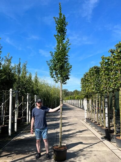 Die Säulenhainbuche 'Lucas' hat bei 16-18 cm Stammumfang eine Gesamthöhe von ca. 350-400 cm bei einer reinen Stammhöhe (bis zu den ersten Ästen) von ca. 210 cm (+/- 10cm).