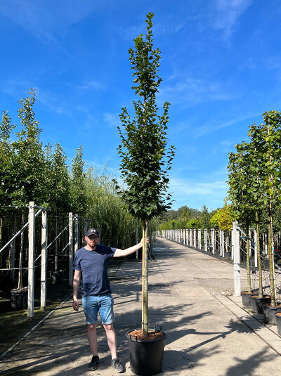Die Säulenhainbuche 'Lucas' hat bei 16-18 cm Stammumfang eine Gesamthöhe von ca. 350-400 cm bei einer reinen Stammhöhe (bis zu den ersten Ästen) von ca. 210 cm (+/- 10cm).