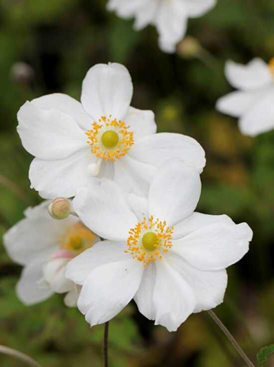 Eigenschaften: Die Anemone japonica 'Coupe d 'Argent' (Herbst-Anemone) bereichert mit ihren zahlreichen zierlichen, weißen Blüten in rispenartigen Blütenständen garantiert Ihren Spätsommer und Herbst. Diese Pracht entwickelt die ansehnliche und robuste Herbst-Anemone am besten an halbschattigen Plätzen auf frischem Boden im Beet, auf der Freifläche oder am Gehölzrand. Dort erreicht sie eine Höhe von bis zu 80 cm. Nutzen Sie die Anemone japonica 'Coupe d' Argent' gerne auch als Bienenweide oder holen Sie sie in die Wohnung in Form eines frischen Straußes. Pflanzen Sie die sommergrüne Staude einzeln oder in kleinen Tuffs von 1-3 oder bis 5 Stück mit 6 Stück pro Quadratmeter und halten Sie einen Pflanzabstand von etwa 40 cm ein. Nehmen Sie einen Rückschnitt der Stängel im Herbst bis Spätherbst vor. An optimalen Standorten ist kaum Pflege nötig. Winterschutz bei Kahlfrost ist ratsam. Die Anemone japonica 'Coupe d 'Argent' ist winterhart bis zu einer Temperatur von -23,3 Grad Celsius..