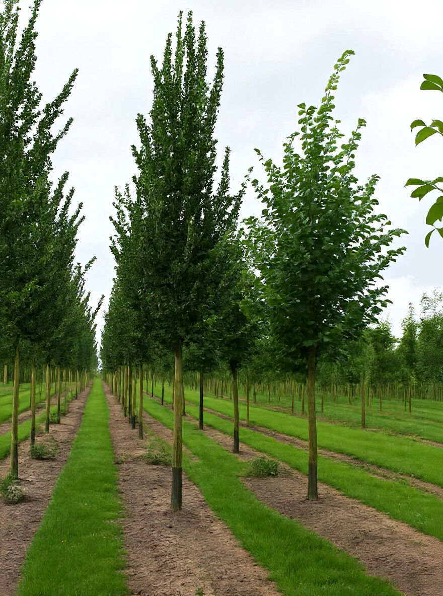 Ulmus 'Columella' / Säulen-Ulme 'Columella' als schlanke, aufrecht wachsende Bäume in Baumschulreihe mit grünem Laub