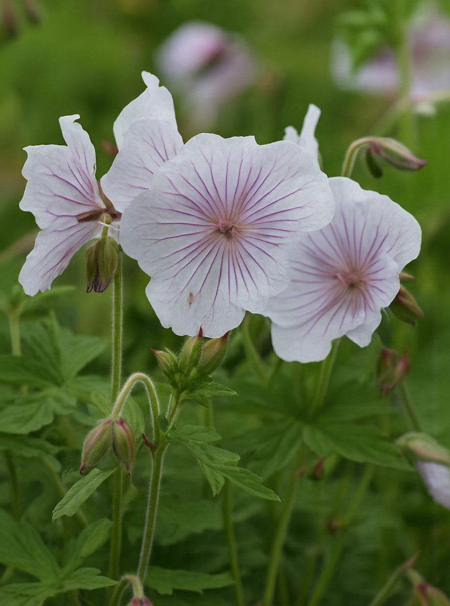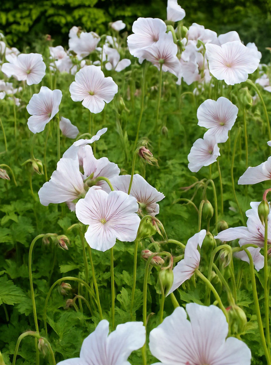 Der Geranium himalayense 'Derrick Cook' (Himalaya-Storchschnabel 'Derrick Cook') wirkt durch ein herrliches, silbrigweißen Blütenmeer, das violette Adern aufweist, besonders eindrucksvoll und wird...