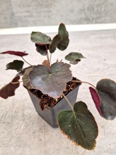 | Blatt: | Immergrün, herzförmig, sehr groß, dunkel purpurrot bis bronzefarben |