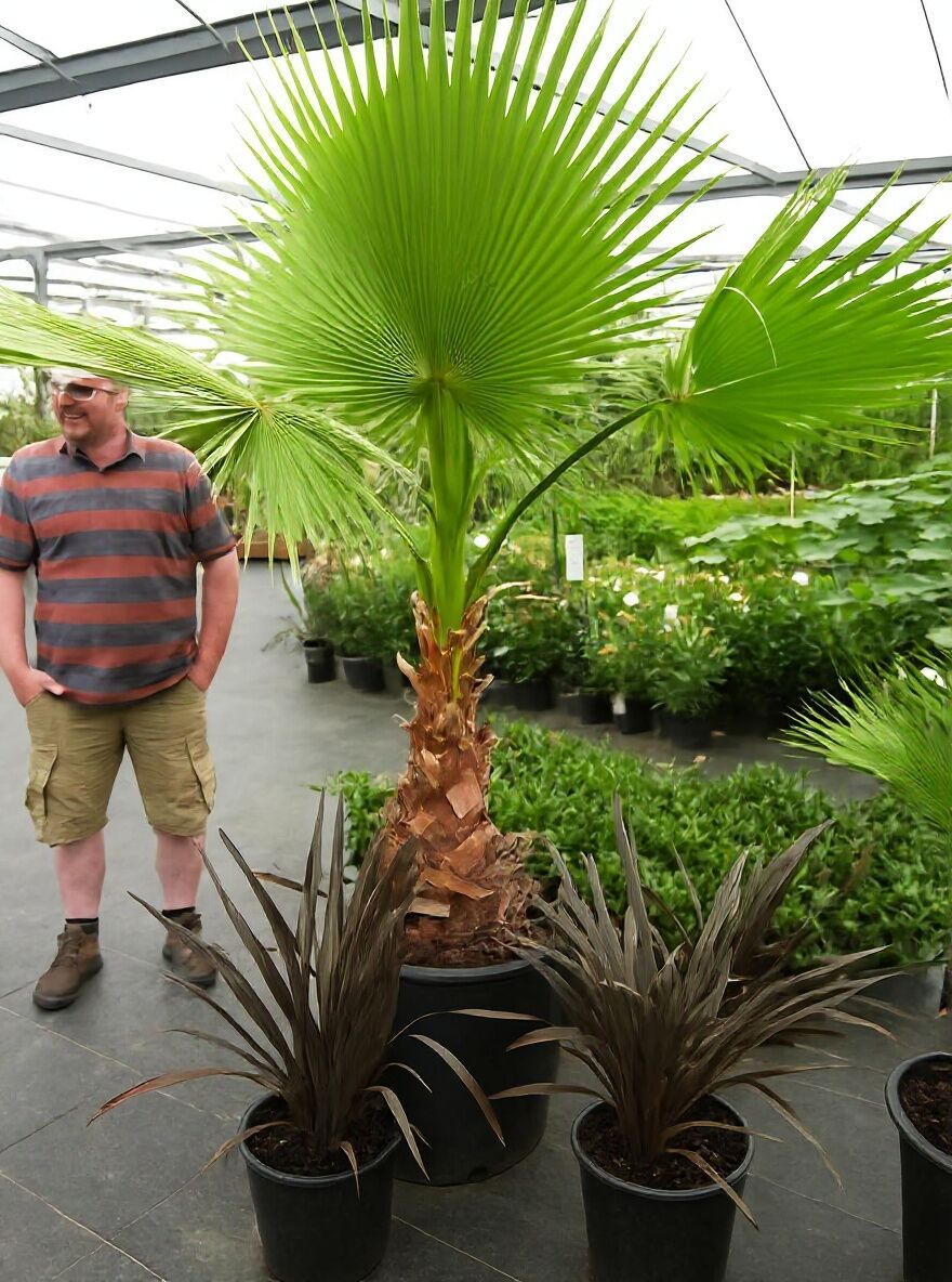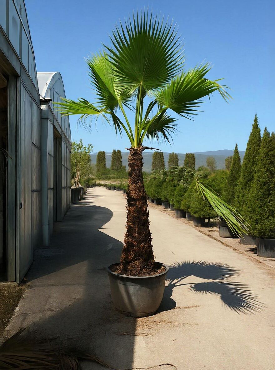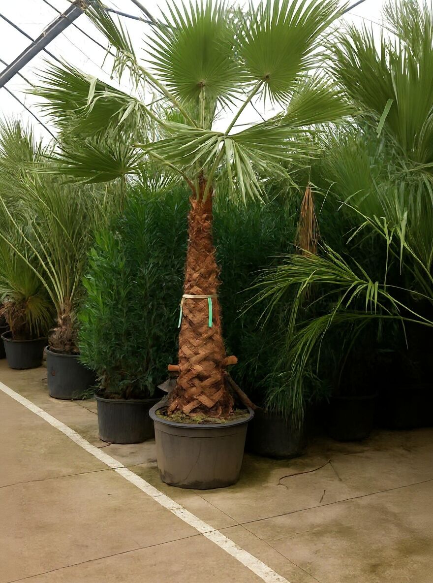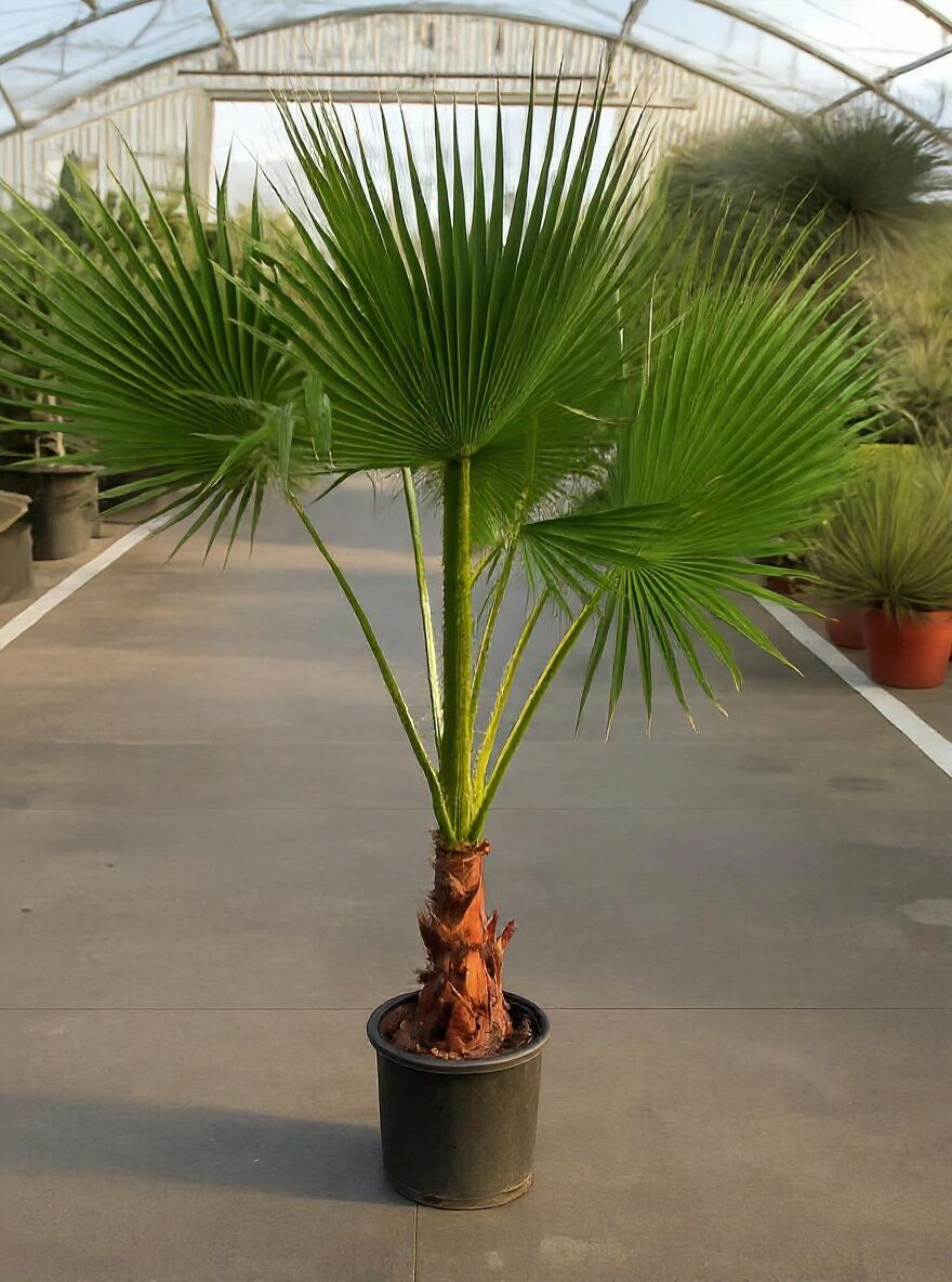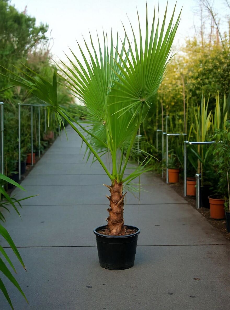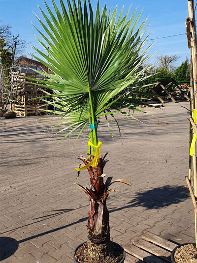 | Eigenschaften: | Die Washingtonia robusta (Petticoat-Palme) gehört zu den ansprechendsten Palmensorten überhaupt. Ein tolles Zierelement, das sich als anspruchslos, robust und pflegeleicht erweist. Als Kübelpflanze im Garten, auf der Terrasse oder im Haus eine dekorative Alternative! Die Kübelpflanze kann von Mitte Mai bis Mitte September nach draußen an einen sonnigen bis halbschattigen Platz gestellt werden. Damit Sie lange Freude an dieser wunderschönen Palme haben, empfehlen wir eine Überwinterung an einen frostfreien Standort, am besten im Haus. Die Washingtonia robusta / Petticoat Palme sollte nach der Überwinterung im Frühling langsam an die Sonneneinstrahlung gewöhnen, indem sie die ersten 10 Tage schattig stehen, um Blattverbrennungen zu vermeiden.. |