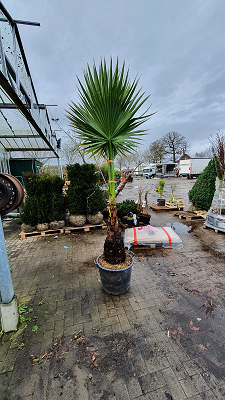 | Eigenschaften: | Die Washingtonia robusta (Petticoat-Palme) gehört zu den ansprechendsten Palmensorten überhaupt. Ein tolles Zierelement, das sich als anspruchslos, robust und pflegeleicht erweist. Als Kübelpflanze im Garten, auf der Terrasse oder im Haus eine dekorative Alternative! Die Kübelpflanze kann von Mitte Mai bis Mitte September nach draußen an einen sonnigen bis halbschattigen Platz gestellt werden. Damit Sie lange Freude an dieser wunderschönen Palme haben, empfehlen wir eine Überwinterung an einen frostfreien Standort, am besten im Haus. Die Washingtonia robusta / Petticoat Palme sollte nach der Überwinterung im Frühling langsam an die Sonneneinstrahlung gewöhnen, indem sie die ersten 10 Tage schattig stehen, um Blattverbrennungen zu vermeiden. |