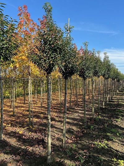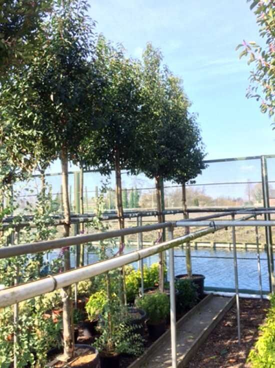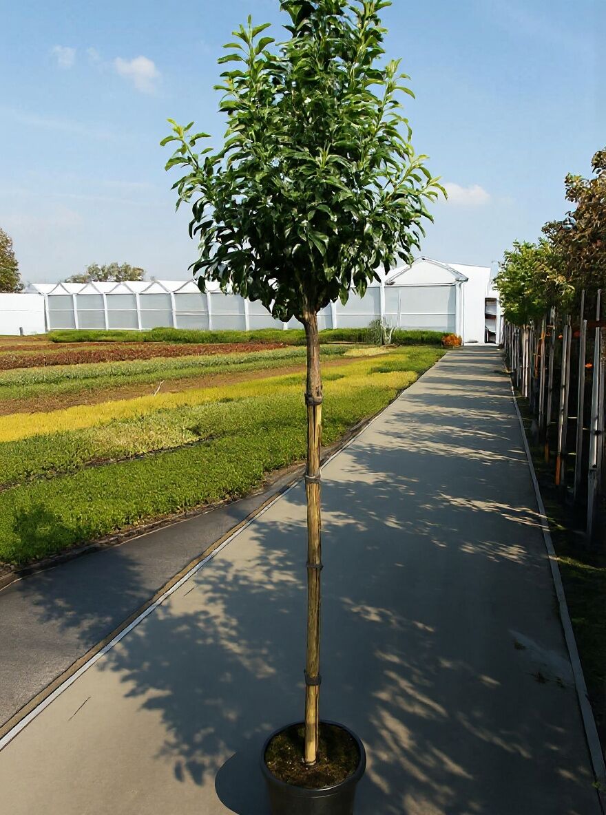 Prunus lusitanica 'Angustifolia' Hochstamm, Portugiesischer Kirschlorbeer: hoher Stamm mit dichter, grüner Krone im Baumschulbestand