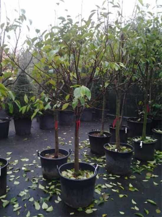 Diospyros kaki (Kakipflaume) Kakibaum Halbstamm 12-14 StU im C35-Topf, mehrstämmig mit grünem Laub.