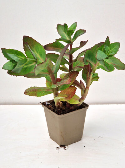 | Blatt: | Sommergrün, sukkulent, oval, Blattrand gekerbt, fleischig, matt, rötlichbraun bis grün. |