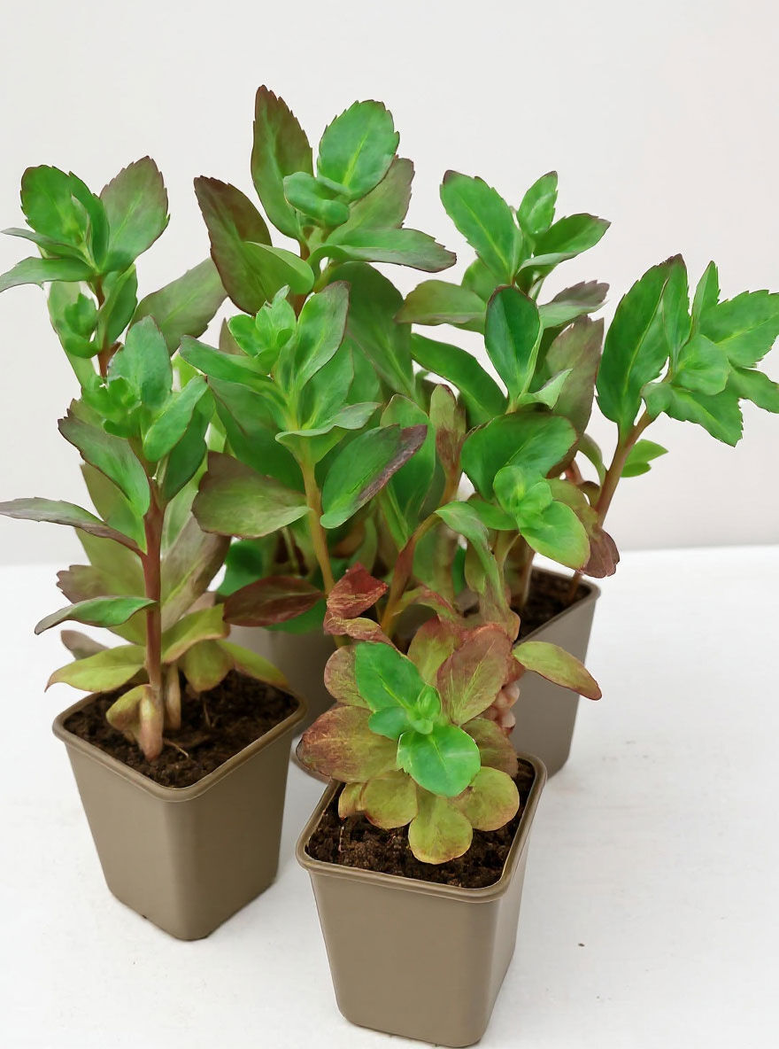 | Blatt: | Sommergrün, sukkulent, oval, Blattrand gekerbt, fleischig, matt, rötlichbraun bis grün |
