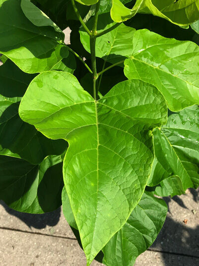 | Blatt: | Herzförmig, sehr groß, im Austrieb ist das Blatt violettartig und wird dann goldgelb, später hellgrün, weich behaart, Herbstfärbung gelb, 10 bis 20 cm lang |