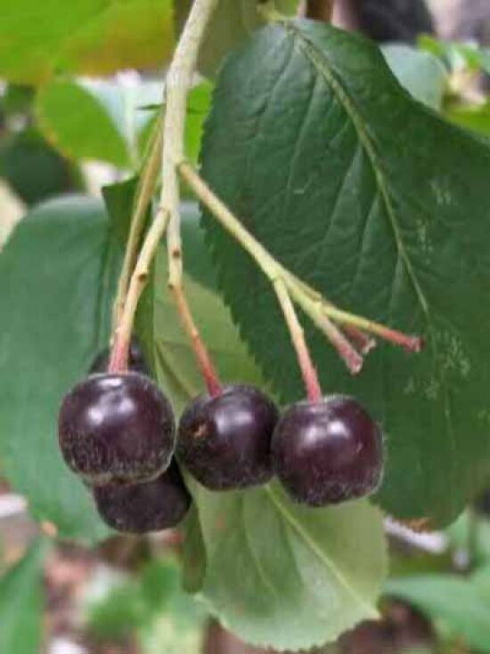 Aronia prunifolia 'Karhumäki' (Schwarze Kulturapfelbeere) mit dunklen Beeren an Stielen und grünen Blättern