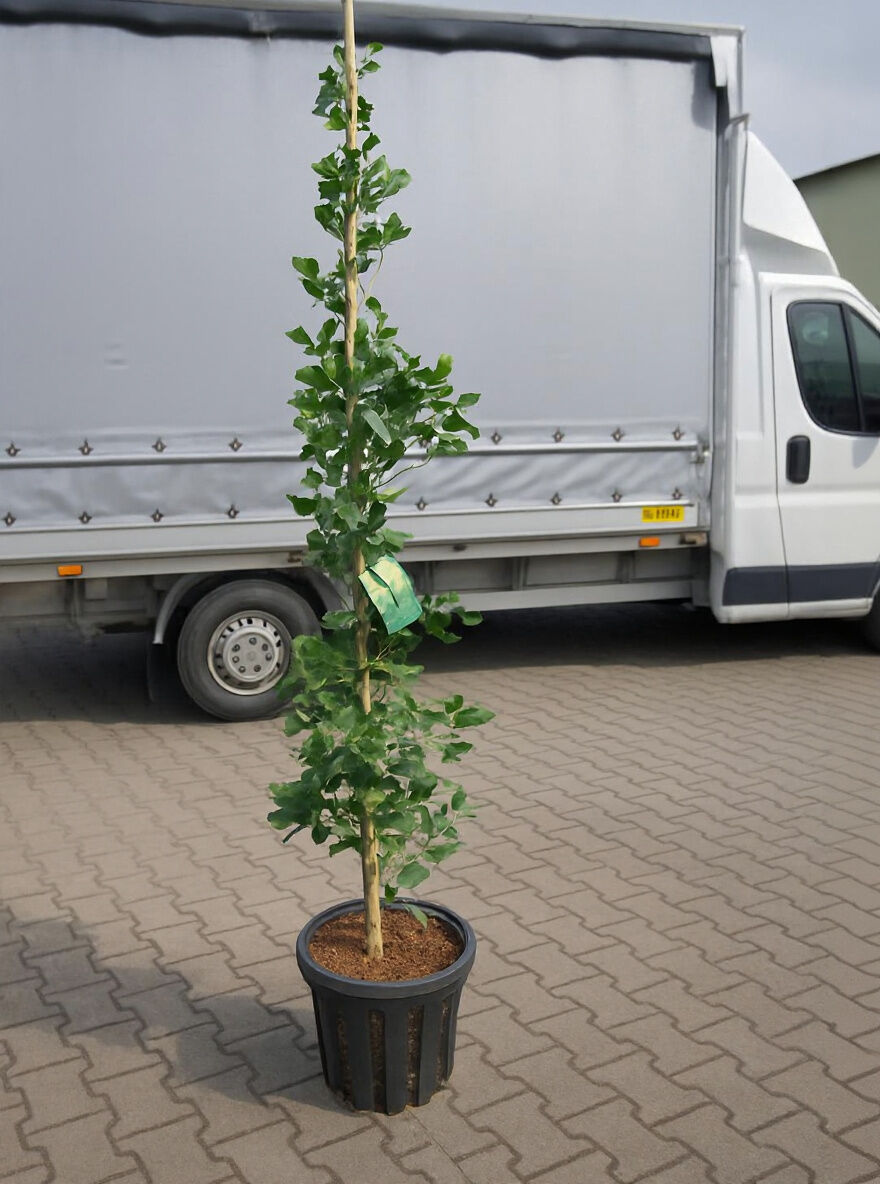 Ginkgo biloba 'Fastigiata Blagon'® (Ginkgo Mädchenhaarbaum), schlanker junger Baum im Topf mit aufrechtem Wuchs und grünen Blättern.