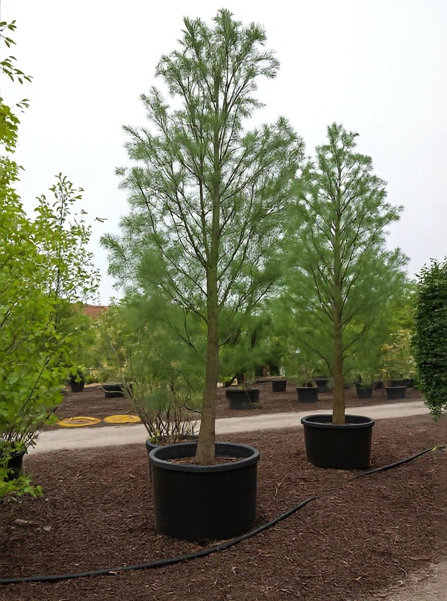 Taxodium distichum 'Nutans' (Nickende Sumpf-Zypresse) als schlanker Baum mit hängenden, weichen grünen Nadeln im Feldanbau