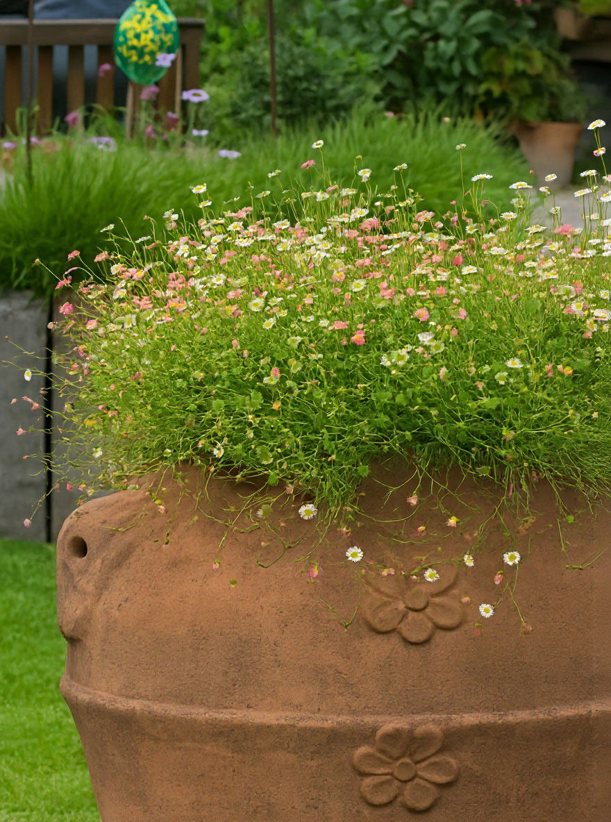 | Eigenschaften: | Die Erigeron karvinskianus 'Blütenmeer' (Spanisches Gänseblümchen) lässt sich gerne auf sonnigen Fels-Steppen und Steinfugen nieder und bevorzugt frischen Boden. Das Überwintern gelingt dem Spanischen Gänseblümchen bei Temperaturen von bis zu -17,7 °C gut. Bei Kahlfrost sollte man jedoch auf einen Winterschutz achten. Stau- und Winternässe verträgt die Erigeron karvinskianus 'Blütenmeer' nicht. Beachten und kontrollieren Sie gegebenenfalls aufkeimende Selbstaussaat. In der Gruppe zieht das Spanische Gänseblümchen seine Aufmerksamkeit auf sich - ein wundervoller Anblick. Wir empfehlen eine Pflanzung in kleinen Tuffs von 3-5 (oder bis 10) Stück und mit 11 - 15 Pflanzen auf den Quadratmeter im Abstand von 20 - 30 cm. Überzeugen Sie sich selbst von dieser Gartenschönheit. |