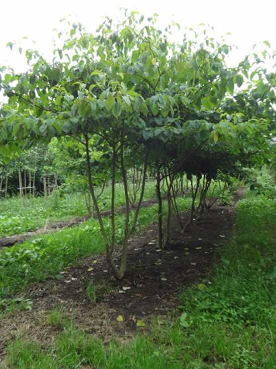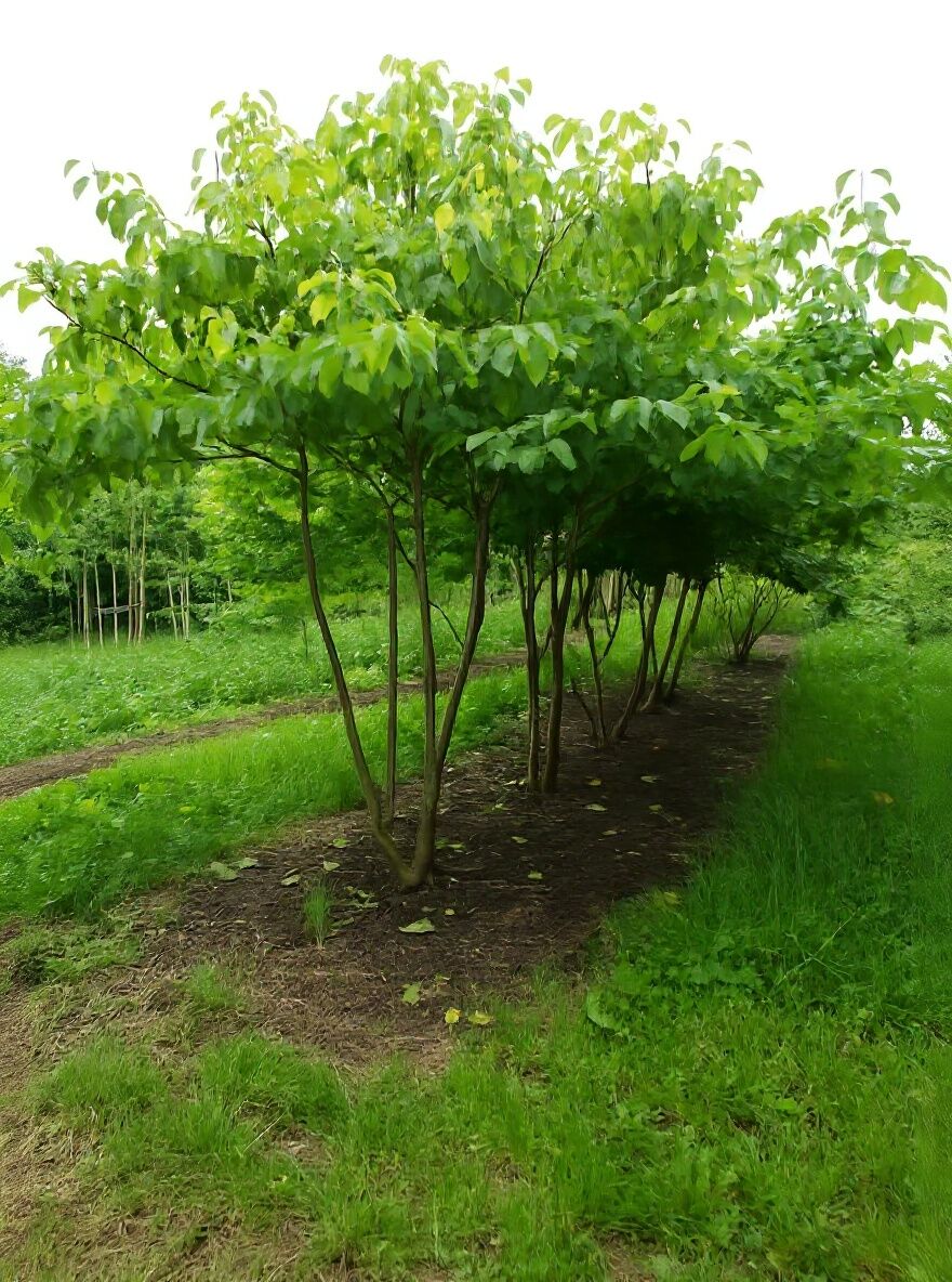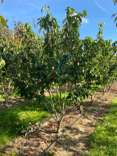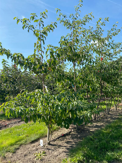Pagoden-Hartriegel (Cornus controversa) mehrstämmig als junger Baum mit schlanken Stämmen und dichter, grüner Krone im Feldbestand.