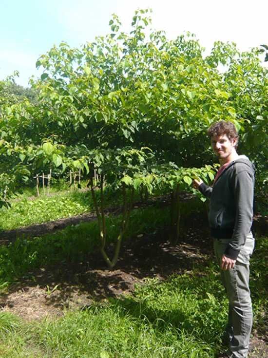 Viele Besucher bleiben stehen und fragen gezielt nach dem Baum, weil sie diese Form nicht kennen. Im Frühjahr die weißen Blüten, im Sommer das frische Grün, im Herbst die gelbe bis rötliche Färbung und im Winter die klare Aststruktur.