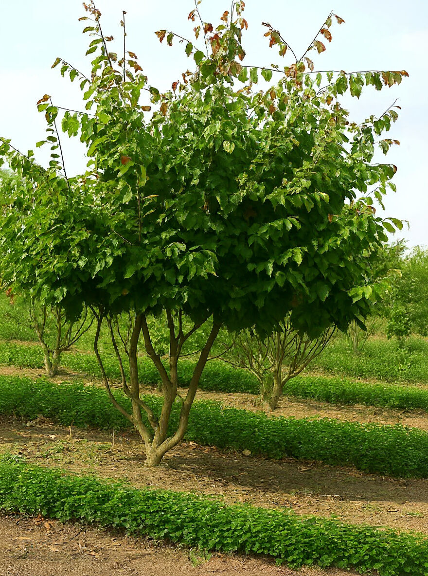 Parrotia persica (Eisenholzbaum), Parrotie mehrstämmig, junger Baum mit mehreren Stämmen und grünem Laub in Baumschule