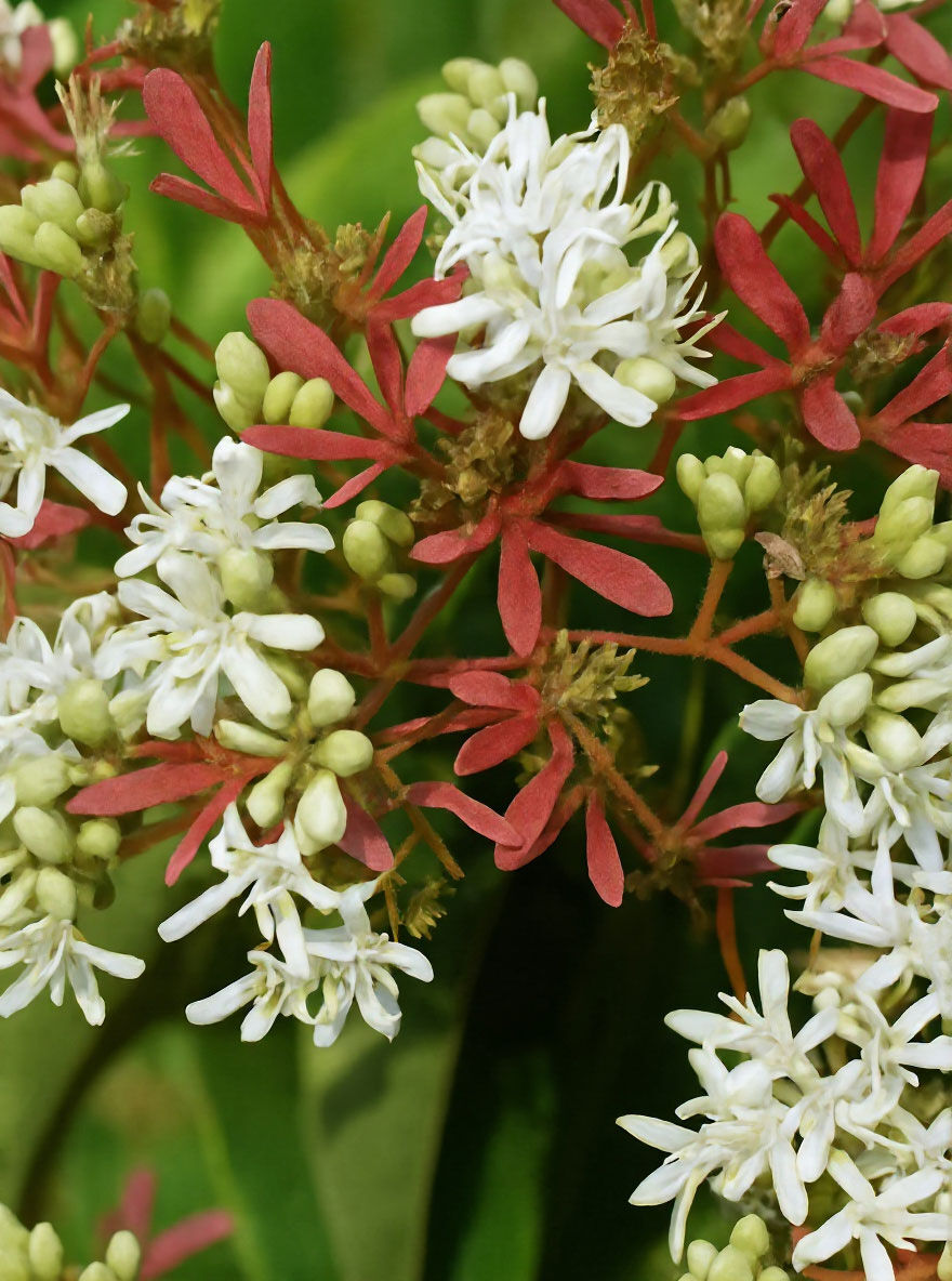 Sieben-Söhne-des-Himmels-Strauch (Heptacodium miconioides) mehrstämmig, Nahaufnahme weißer Blüten mit roten Kelchblättern