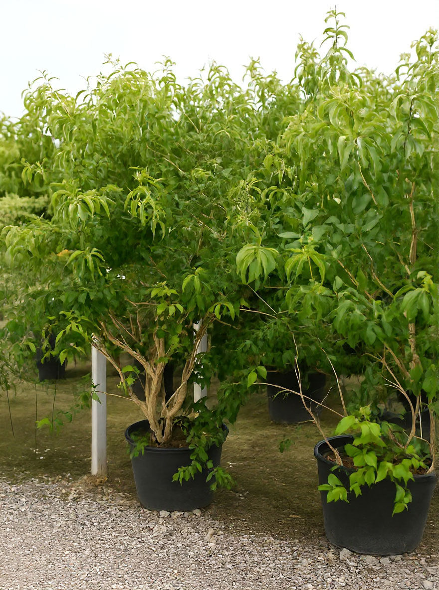 Heptacodium miconioides, Sieben-Söhne-des-Himmels-Strauch, mehrstämmig im Topf, buschiger Wuchs mit grünem Laub
