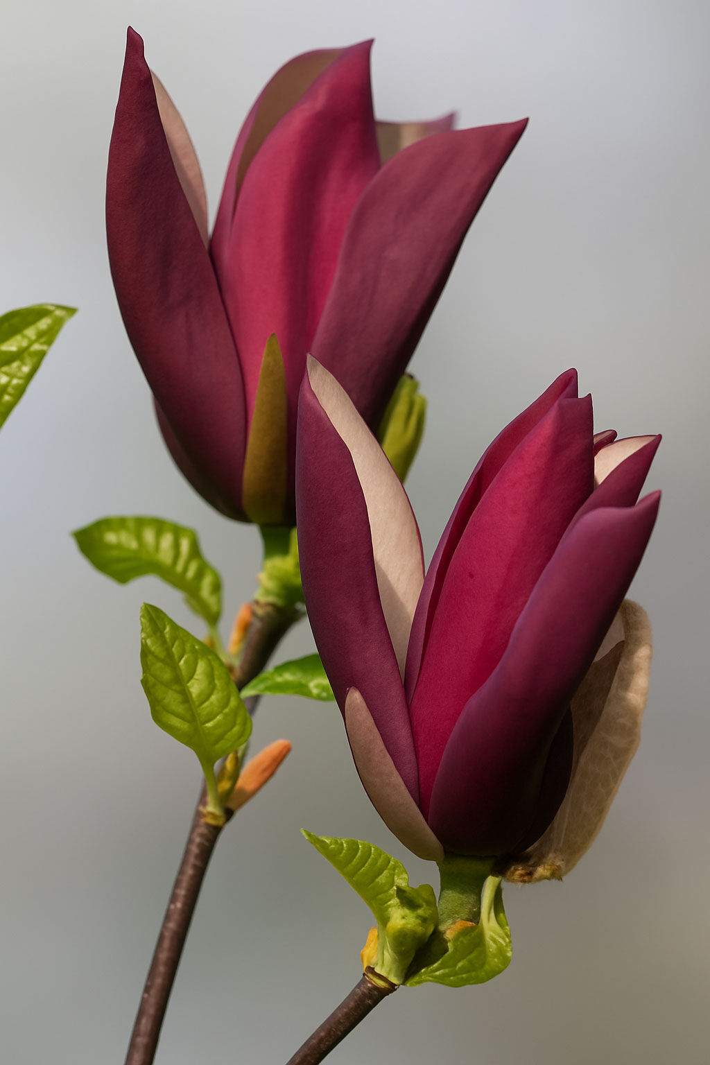 Extravagante Blüte der Magnolie ’Black Beauty‘ überrascht mit apartem Farbenspiel