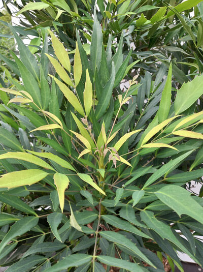 | Blatt: | Immergrün, schmal, palmenartig, mittelgrün. |
