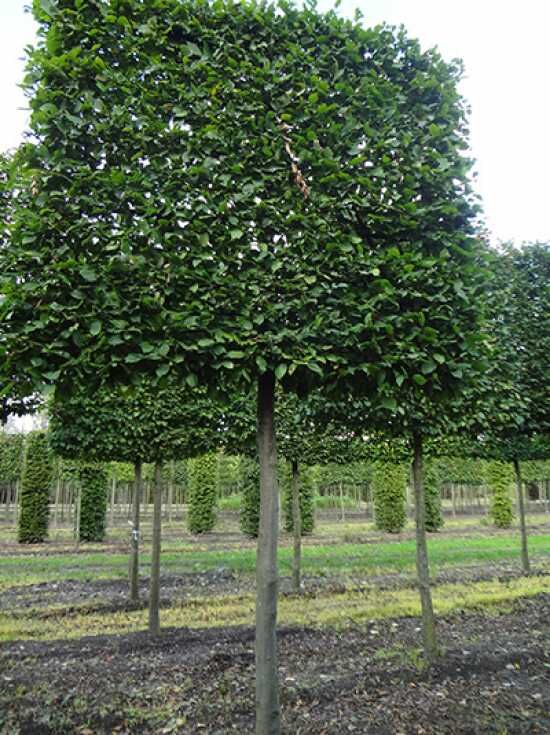 Carpinus betulus (Hainbuche/Weißbuche) Hochstamm-Spalier, Baum mit Stamm und dichter, rechteckig erzogener Krone.