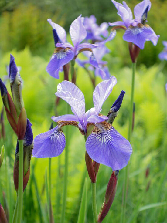 Wiesen-Iris (Iris sibirica, Wildform) mit violettblauen Blüten an schlanken Stielen im grasartigen Laub
