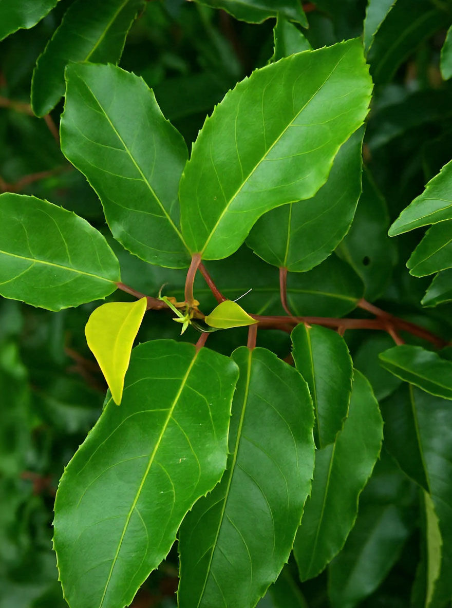 | Blatt: | Immergrün, länglich-eiförmig, glänzend, dunkelgrün, am Ende zugespitzt, bis zu 6 cm 5 cm lang. |