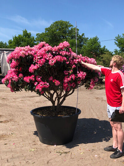 Der Rhododendron yakushimanum 'Sneezy' in Schirmform ist eine bemerkenswerte Sorte mit einzigartigen Merkmalen. Die Wuchshöhe dieses speziellen Rhododendrons beträgt etwa 160 cm, während die Breite etwa 220 cm beträgt. Mit seiner kompakten und breitbuschigen Wuchsform bildet er eine attraktive Schirmform, die dem Garten eine elegante Struktur verleiht. Diese Größe macht ihn zu einer idealen Wahl für kleinere Gärten, Terrassen oder als dekoratives Element in Innenhöfen.