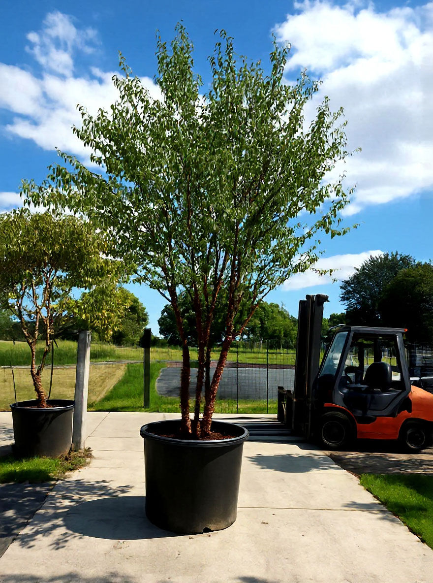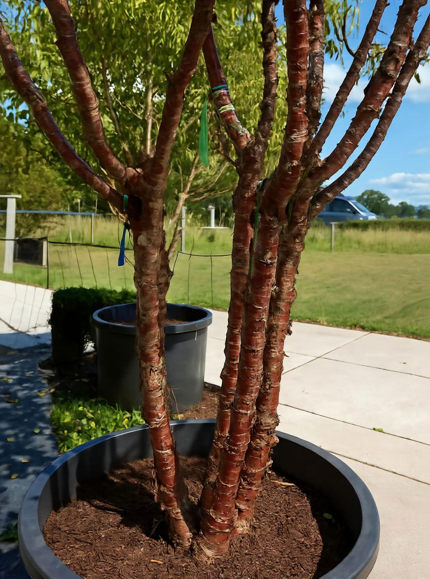 Prunus serrula (Mahagoni-Kirsche) 'Schirmform' 450-500 cm, mehrstämmiger Baum im Container mit schirmartiger Krone.