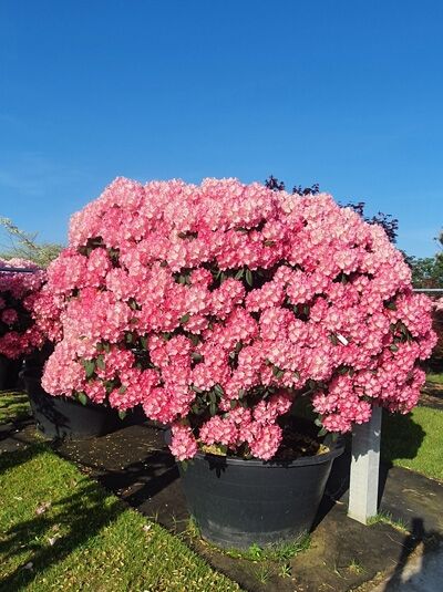 Rhododendron yakushimanum Schirmform / Rhododendron 'Schirmform' im Container, schirmförmig, dicht belaubt, rosa Blüten, 160–170 cm