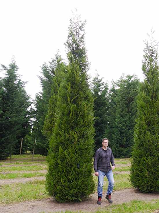 Thuja plicata 'Excelsa' – Lebensbaum 'Excelsa' Solitär 450–500 cm mit Drahtballen, schlank aufrechter Nadelbaum im Feld
