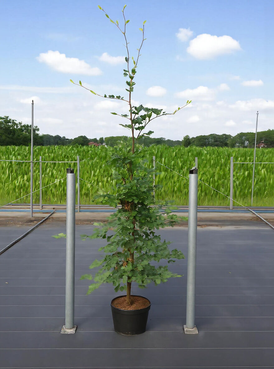 Fagus sylvatica Rot-Buche Heckenpflanze im Topf, Höhe 200-250 cm, Container C12, mit schlankem Stamm und grünem Laub.