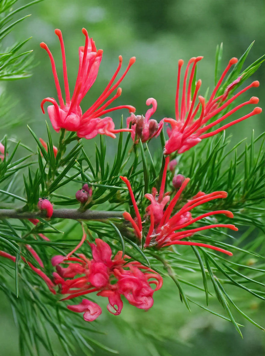 Rosmarin-Silbereiche (Grevillea rosmarinifolia) mit roten, spinnwebartigen Blüten und nadelartigen grünen Blättern am Zweig.