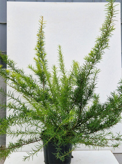 Rosmarin-Silbereiche (Grevillea rosmarinifolia), 50–60 cm, C10, im Topf mit aufrechten Trieben und schmalen, nadelartigen Blättern.