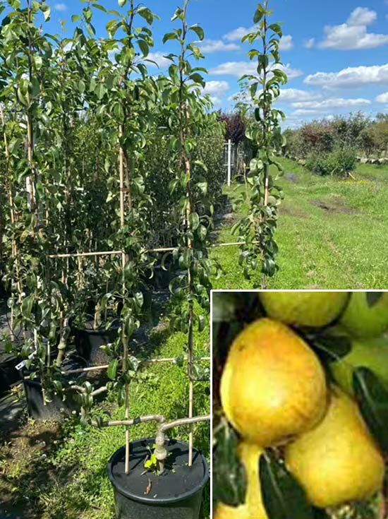 Pyrus communis 'Gute Luise' – Birne 'Gute Luise von Avranches' Doppel-U Spalier im Topf mit Laub und Früchten