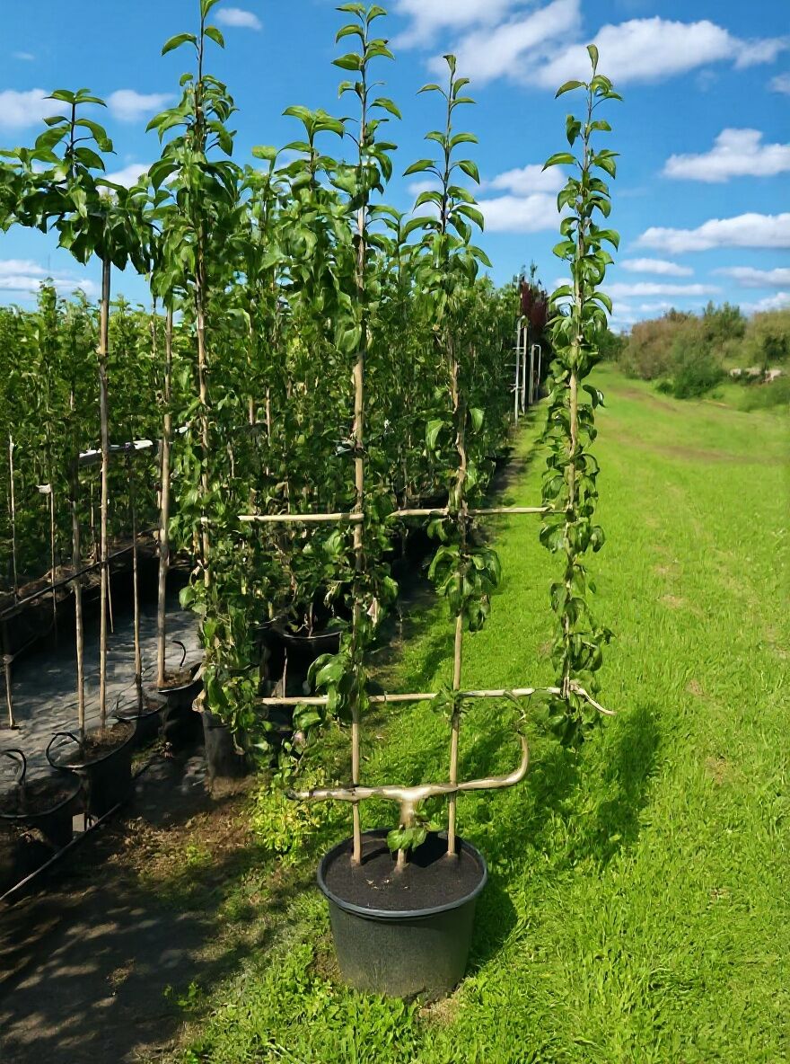 Das Birnenspalier ‘Gute Luise’ als Doppel-U wurde in einer Qualität geliefert, die wirklich herausragt. Der Aufbau ist absolut exakt, die Form sauber gezogen und der Stamm wie auch die Leitäste kräftig und gleichmäßig gewachsen. Das Laub war frisch und gesund, und der Wurzelballen stark durchwurzelt – ein klarer Hinweis auf professionelle Kultur. Nach dem Einpflanzen ist das Spalier sofort sehr gut angewachsen und macht im Garten einen eleganten, hochwertigen Eindruck. Besonders schön: Die Nachbarn waren so begeistert vom Ergebnis, dass sie gleich selbst nachbestellen wollten.