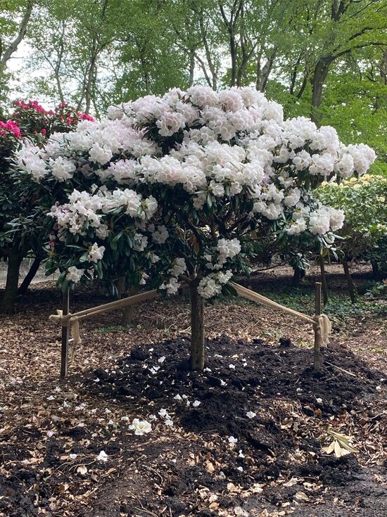 Verwendungsmöglichkeiten vom Rhododendron yakushimanum 'Mist Maiden' auf Stamm Krbr. 180-200 Sth. 60-80