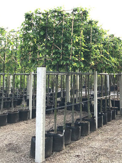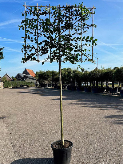Carpinus betulus 'Spalier' Hainbuche als Hochstamm-Spalier im Container, rechteckig erzogene Krone am Spalierrahmen.