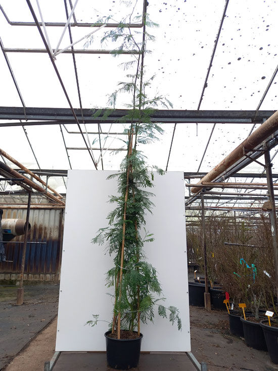 | Eigenschaften: | Die Acacia dealbata (Silber-Akazie / Falsche Mimose) überzeugt vor allem durch die unglaubliche filigranen Blättern und der dekorativen gelben Blütenpracht. Um farbenfrohe und einzigartige Akzente zu setzen, darf die Silber-Akazie nicht fehlen! Vor allem als Kübelpflanze auf Terrassen oder in Wintergärten sehr zierend. Ab Mitte Mai bis Mitte September kann die Pflanze nach draußen gestellt werden. Für die Überwinterung benötigt die Pflanze einen sehr hellen Standort bei einer Temparatur von + 8 Grad bis + 5 Grad. Zusätzlich sollte die Gießemenge und -häufigkeit in der Winterruhe angepasst werden und auf eine gleichmäßige Bodenfeuchtigkeit geachtet werden. Bei einen zu dunklen Standort oder wiederholten Trockenheit kann die Acacia dealbata (Silber-Akazie / Falsche Mimose) mit einen Laubabwurf reagieren. |