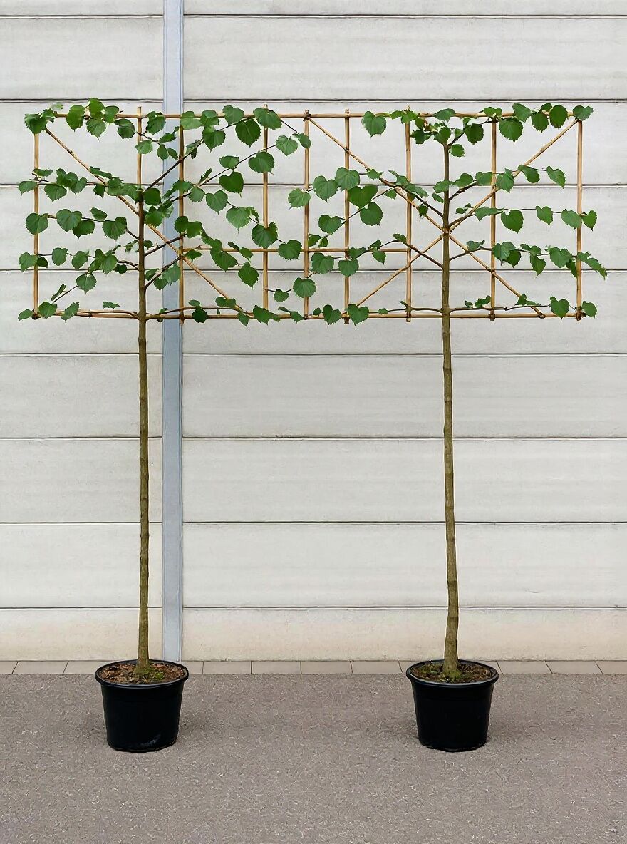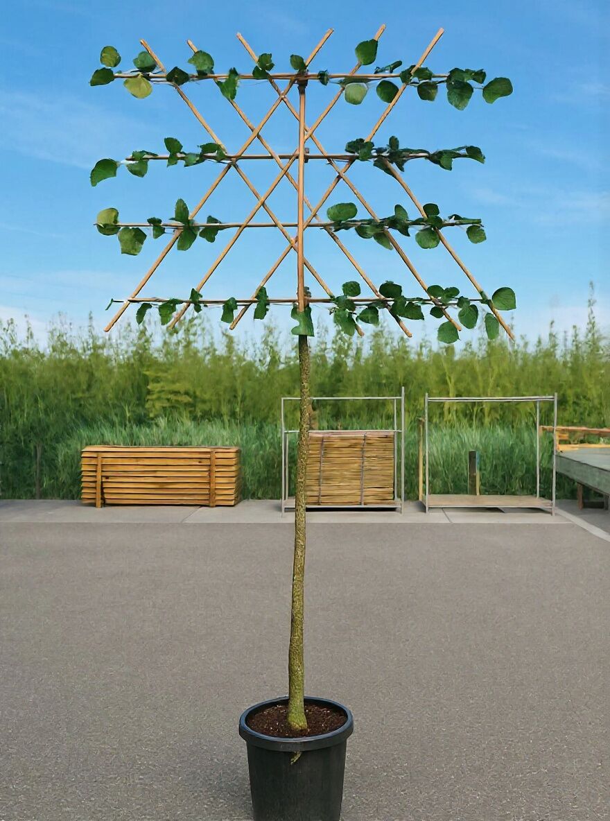 Tilia europaea 'Pallida', Kaiserlinde Hochstamm-Spalier, Stamm 180 cm, Spalierkrone ca. 120 x 150 cm im Topf
