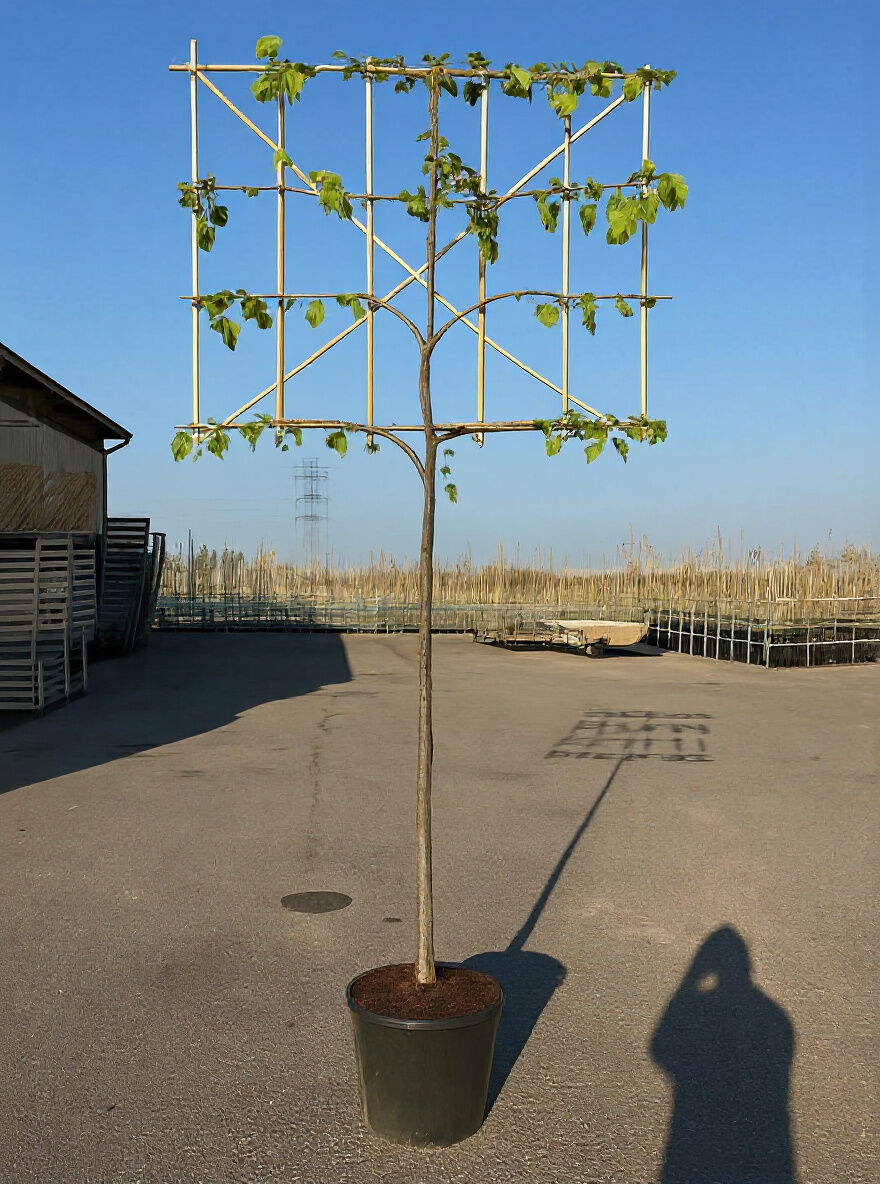 Tilia europaea 'Pallida' / Kaiserlinde Hochstamm-Spalier, Stamm 200 cm, Spalierkrone ca. 120 x 120 cm im Topf.