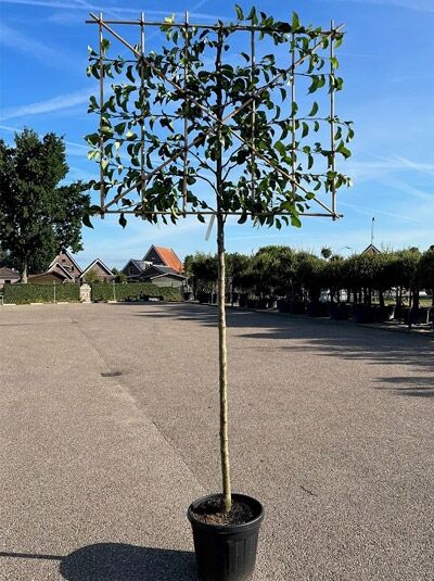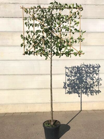 Pyrus calleryana 'Chanticleer' / Chinesische Wildbirne, Hochstamm-Spalier im Container, Stamm 200 cm, mit Spaliergerüst.