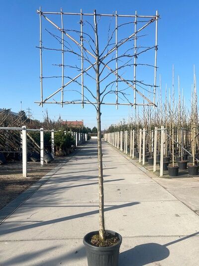 Pyrus calleryana 'Chanticleer' – Chinesische Wildbirne Hochstamm-Spalier im Container, Stamm 180 cm, Krone am Spaliergerüst.