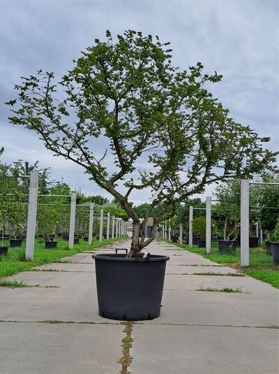 Wuchs: | Kleiner Baum, strauchförmig breitbuschig, dichter unregelmäßiger Wuchs, Äste leicht gedreht, im Alter schirmartige Krone, schwachwüchsig, 4 bis 6 m hoch und bis zu 2 bis 3 m breit |
