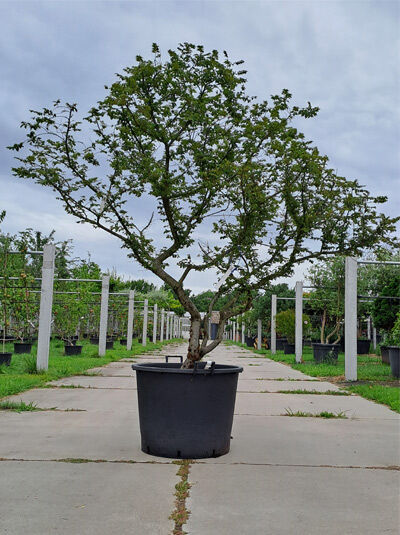 Wuchs: | Kleiner Baum, strauchförmig breitbuschig, dichter unregelmäßiger Wuchs, Äste leicht gedreht, im Alter schirmartige Krone, schwachwüchsig, 4 bis 6 m hoch und bis zu 2 bis 3 m breit. |