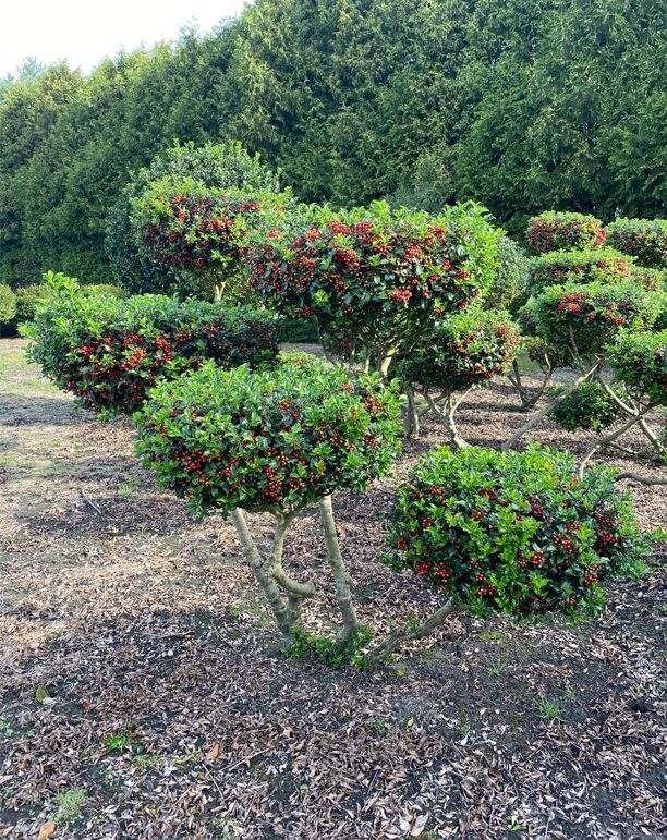 Garten-Bonsai: Ilex meserveae 'Blue Princess' (Stechpalme) 170 cm breit, 150 cm hoch, mehrstämmig, mit roten Beeren, 125–150 cm m. Db.