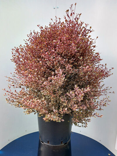 Lophomyrthus ’White Tiger‘ / Schopfmyrthe ’White Tiger‘, buschiger Strauch im Topf mit rotbraunem Laub und kleiner Blattpanaschierung.