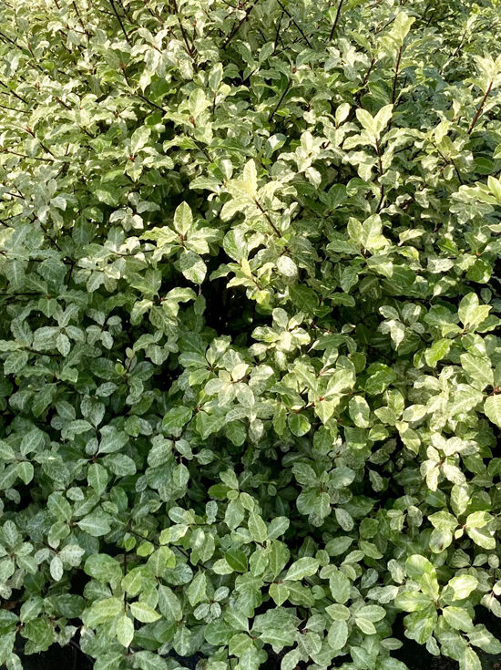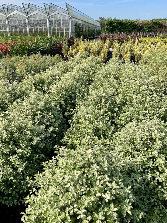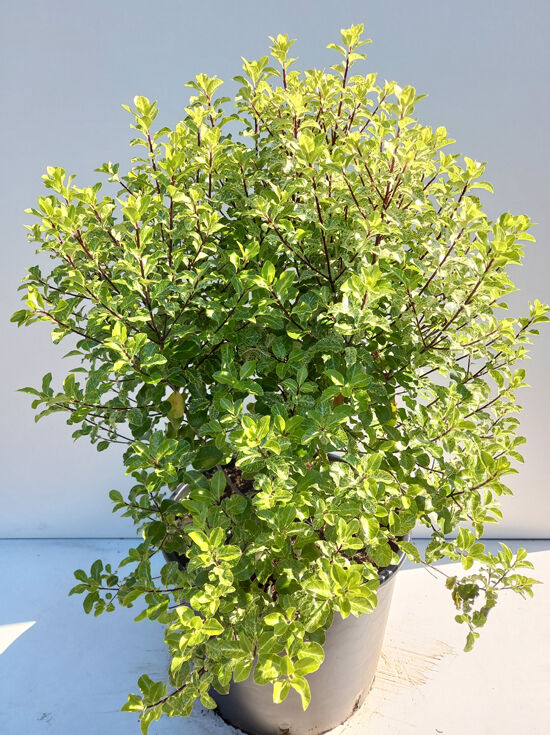 | Eigenschaften: | Der Pittosporum ’Irene Patterson‘ ist eine immergrüne Zierpflanze, die gerne als Kübelgewächs oder auch als Heckenelement gepflanzt wird. Der kleine Strauch begeistert im Jahresverlauf mit einem aparten Farbenspiel seines Blattwerks und bietet einen grandiosen Anblick. Das Blatt zeigt sich zunächst zart in Cremetönen, um dann im Sommer weiß- grün zu leuchten. Im Winter setzt eine rosa Blattfärbung malerische Akzente und bringt auch an grauen Tagen etwas Farbe in den Garten. Obgleich die Selektion als recht genügsam gilt benötigt sie im Winter etwas Unterstützung. Dann verwöhnt sie zuverlässig als Heckenstar oder als attraktives Kübelgewächs den Garten, die Terrasse oder auch einen Eingangsbereich. |