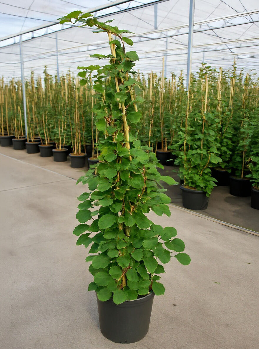 Hydrangea anomala petiolaris (Kletter-Hortensie) im Topf, aufgebunden an Stäben, mit grünen Blättern und Klettertrieben.